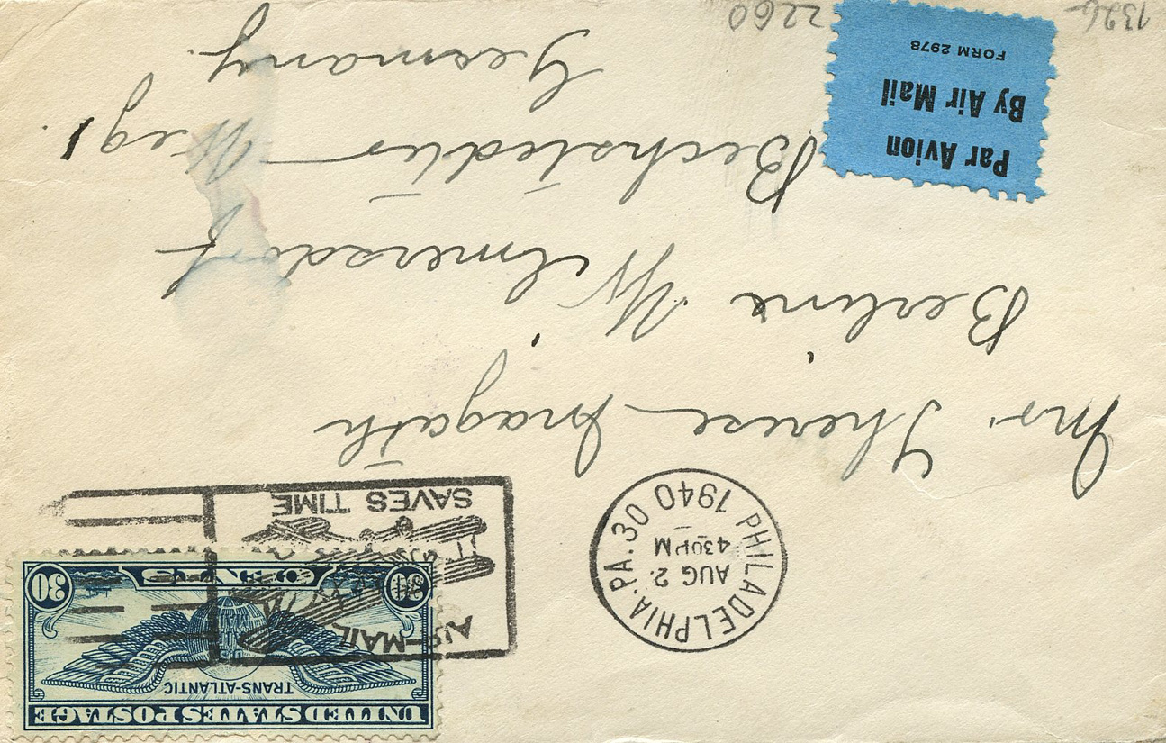 [Below: American envelope canceled on August 2, 1940 and sent to Germany. Front.]