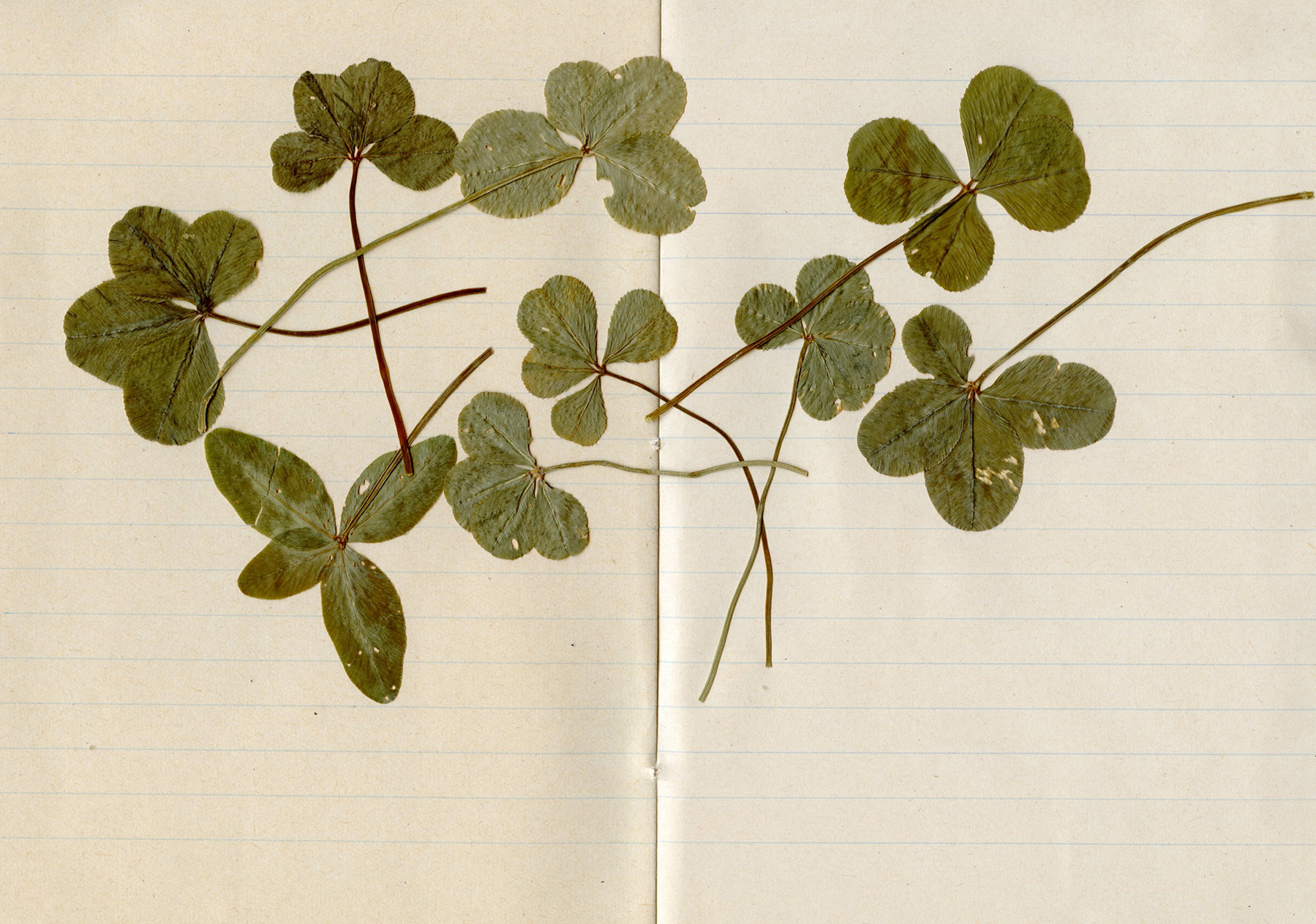 [Below: Four leaf clovers flattened at the back of the book, picked on a sunny day unremembered, by a hand also forgotten.]