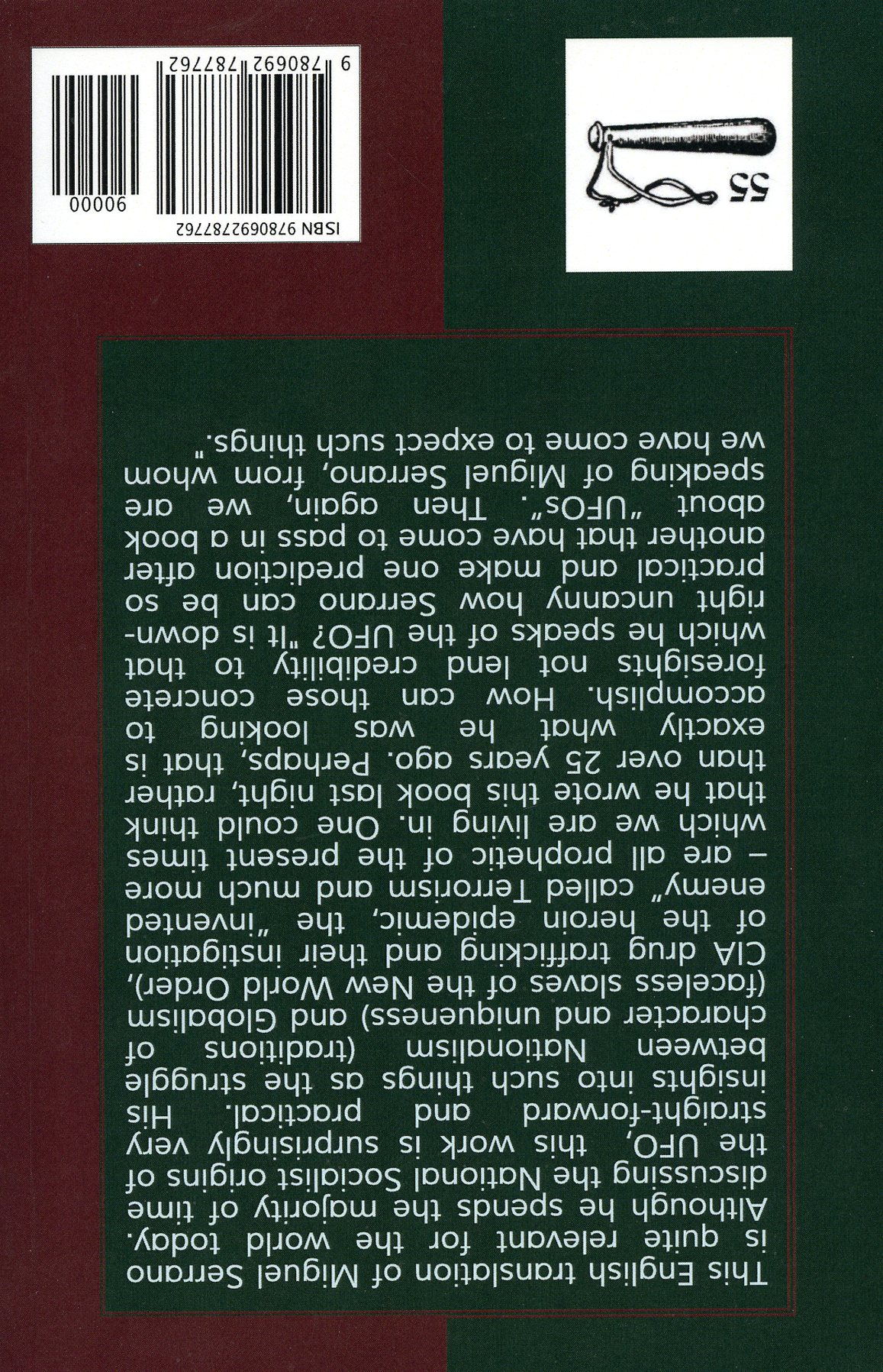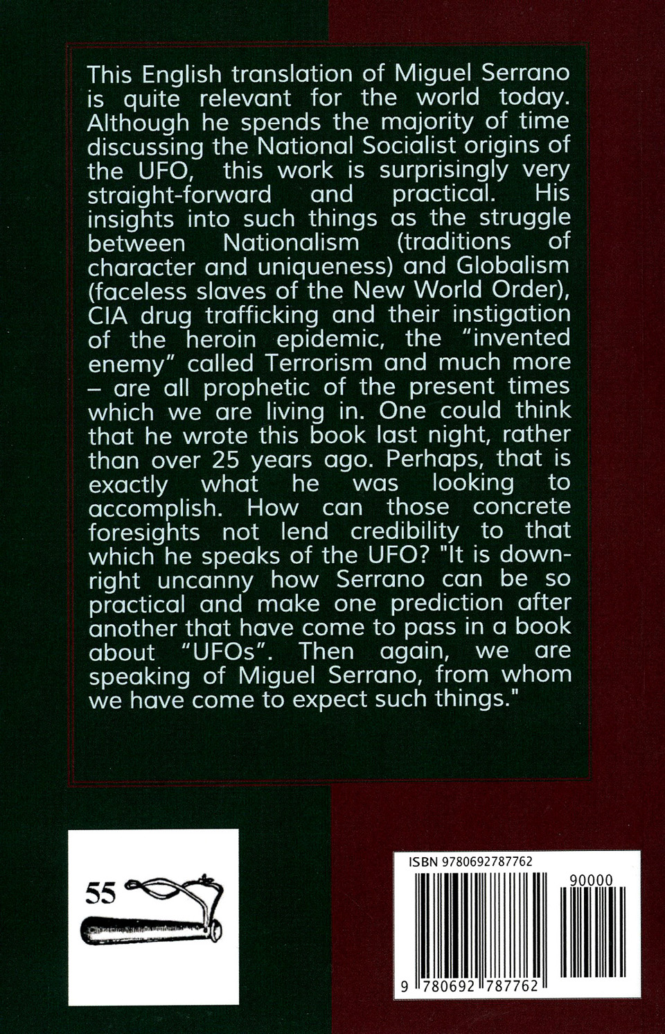 [Below: The Vinlanders - Featuring Miguel Serrano: 'We Will Not Celebrate the Death of the White Gods'. (c) 1992/2020. The 55 Club. 344 pages. Back. Click to enlarge.]