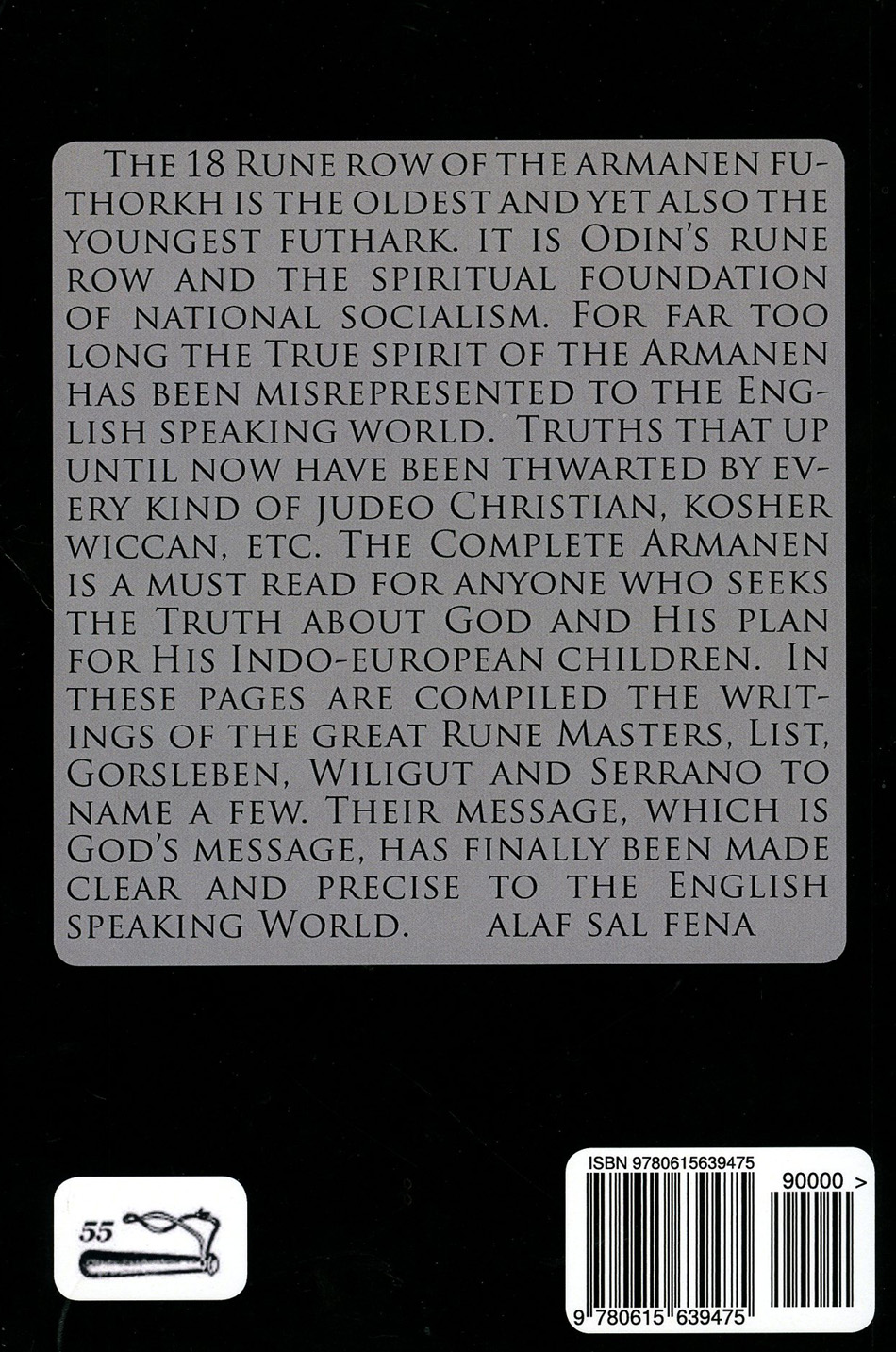[Below: The Complete Armanen (This book has a chapter dedicated to Miguel Serrano). (c) 2012. 55 Club. 356 pages. Back. Click to enlarge.]