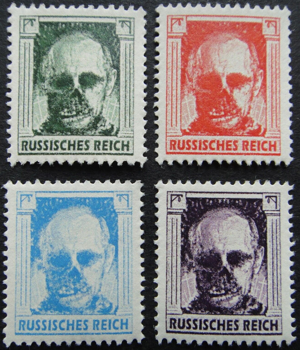 [Below: Oh very imaginative. This one, with Putin taking off his mask revealing death beneath, was taken from an ACTUAL Austrian stamp from after WW2. It was part of an Allied occupation series of stamps that they cancelled at the last minute because... get this... you will hardly believe it but they actually cancelled the set because they found it to be too 'pro-Nazi'. Wtf? Okay, so I guess this one is pro-Putin?]