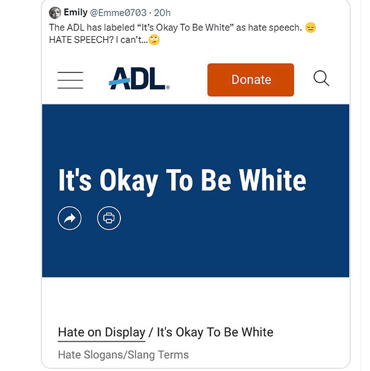 [Above: Wow, this is truly some clown world stuff here. So the leading Jewish organization in the USA has labeled being okay with being white hate speech? The insanity escalates. Imagine if they said this about ANY OTHER RACE. Only the white race would let this slide. We have developed into a weak, suicidal and pathetic people. Self-hating, brainwashed and embarrassing.]