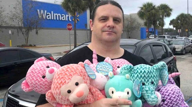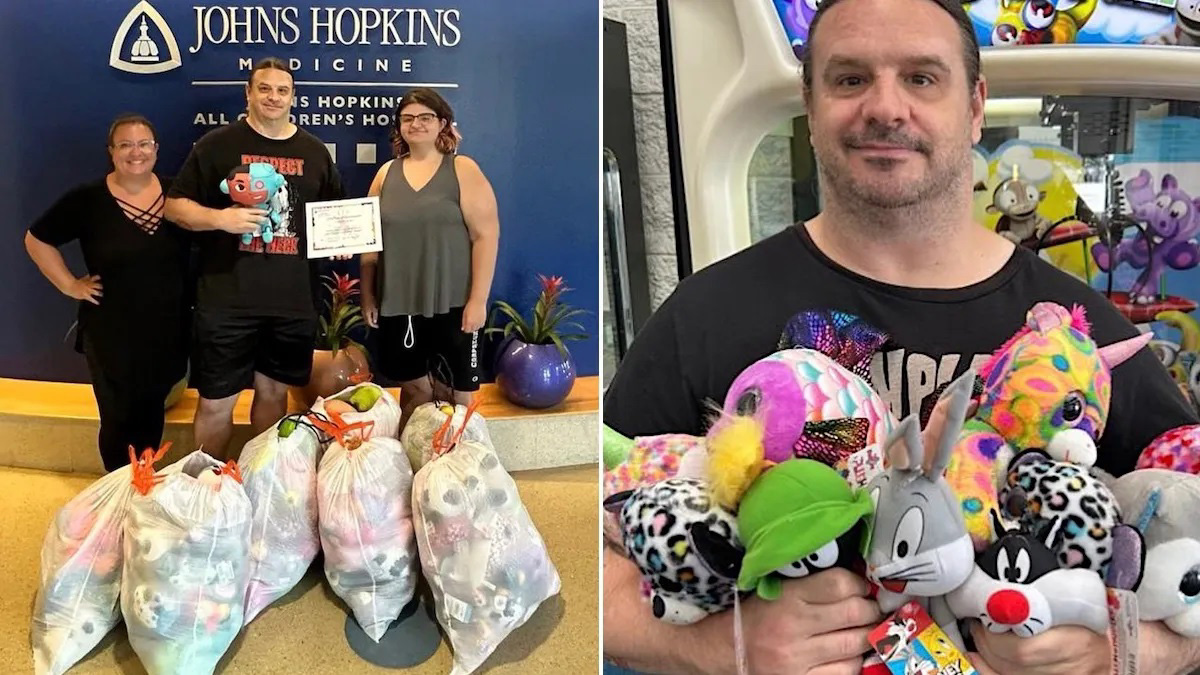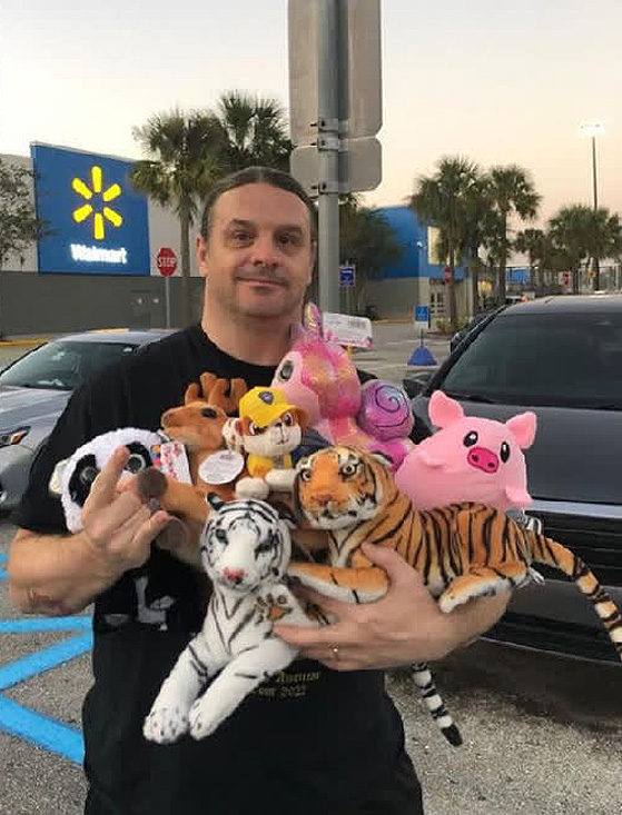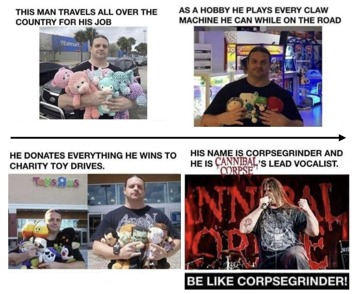 Note: This is the vocalist for the death metal band Cannibal Corpse, his stage name is Corpsegrinder. Apparently he's been donating the plushies he wins to children's hospitals and other charities. But what's most surprising is how the hell he wins anything from those claw machines. He is said to be an expert.