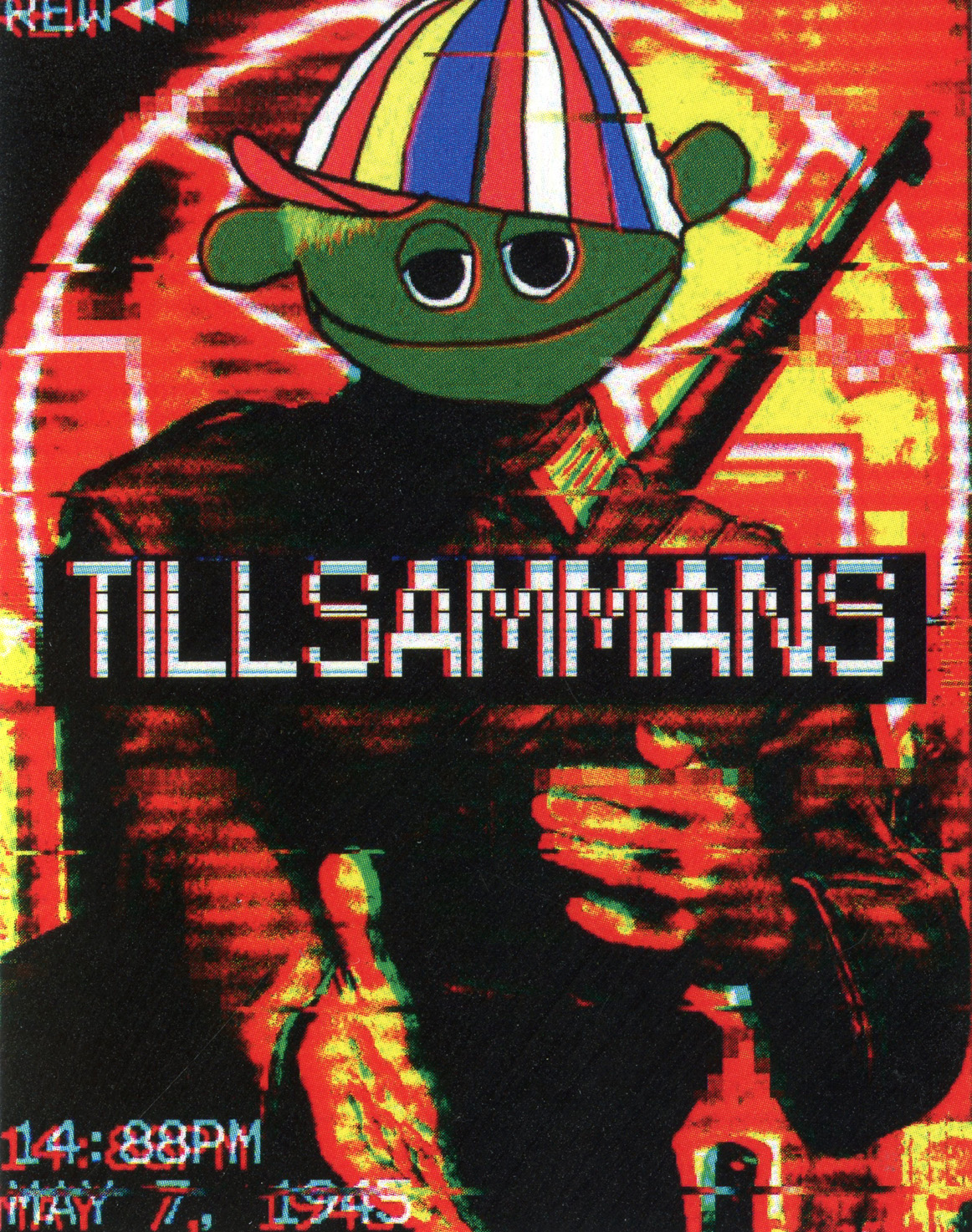 [Below: This odd sticker says 'Tillsammans (Swedish for 'Together'). This uses an Italian WWII poster... May 7, 1945 is the day Germany surrendered to the bloodsoaked tyranny of the Allies. 14:88 is something that becomes more real everyday and is a quote from Mein Kampf popularized by the great martyr David Lane.]
