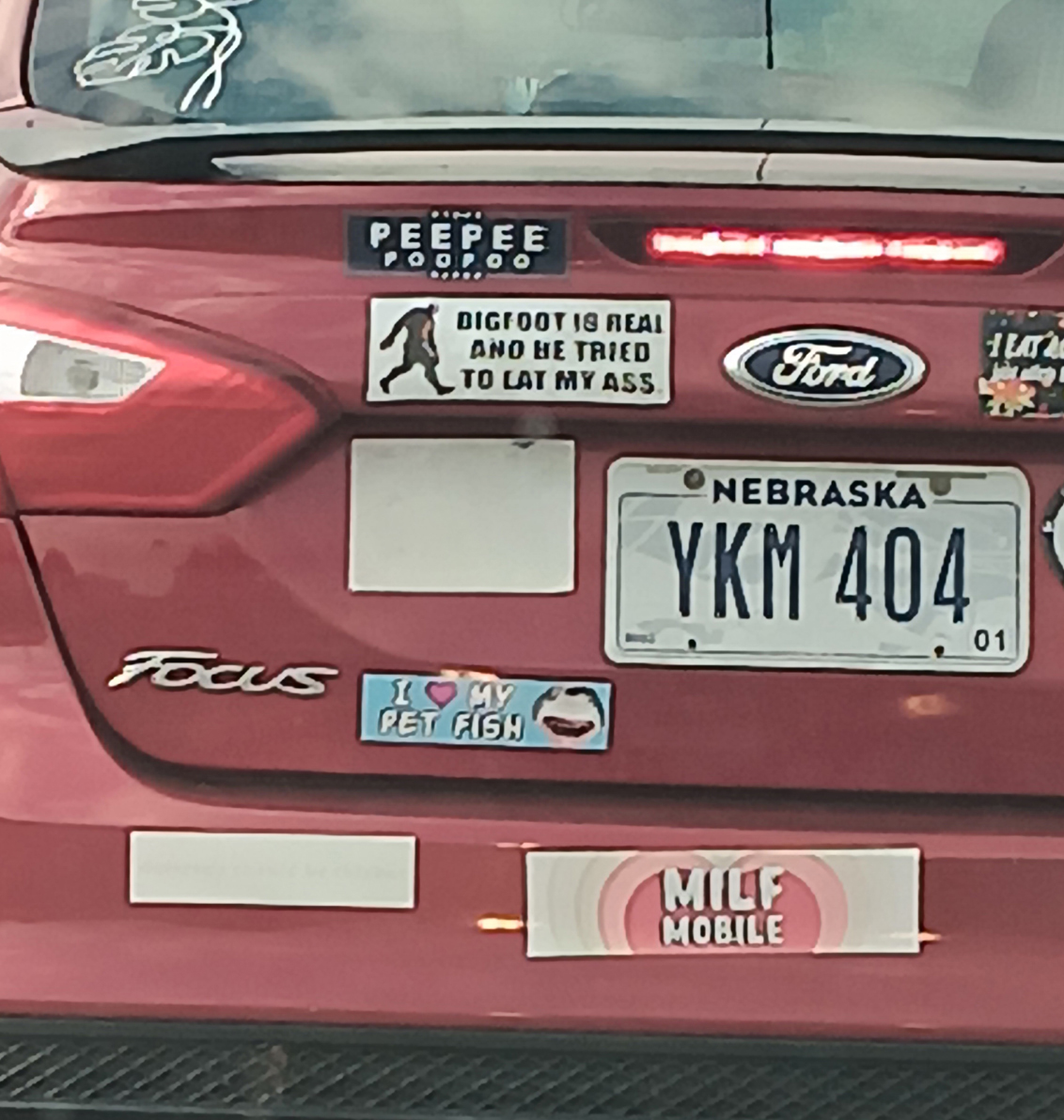 Note: 'Bigfoot is real and he tried to eat my ass'... 'Peepee poopoo'... can you imagine being so vile? What sort of mental illness would make a person put these stickers on their car?