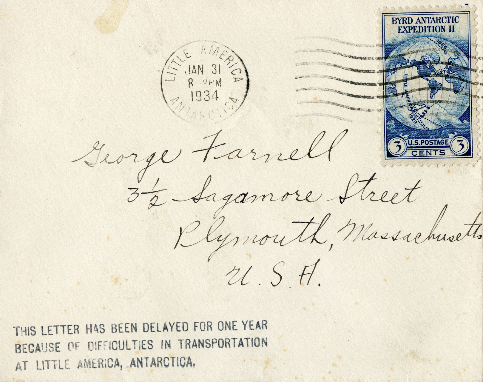 Note: This oddity was sent to Plymouth, Massachusetts, on January 21, 1934, from Little America, Antarctica.