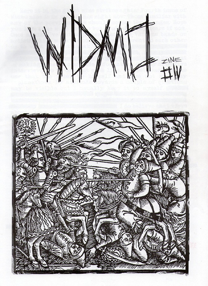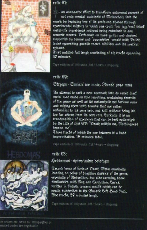 [Note: Here is a cool 'zine from Poland. I was impressed with the style and content of this mag, it's always great to see 'zines like this in today's commercially rotten age. Widmo 'zine features many Polish underground acts, in what would appear to be a vibrant scene. Amongst the interviews found within its forty pages are: Seges Findere, Temnozer, Dark Fury and even Dark Throne, along with more unknown bands. The interviews are knowledgable, in-depth and lengthy. Widmo is also hand-numbered, but I'm unsure of its print-run. Strangely, there is no contact address, leaving the reader to 'get in touch if you know how'!]