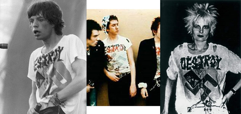 [Above: Mick Jagger, Steve Jones (Sex Pistols) and Vivienne Westwood, each wearing the Destroy swastika shirt.]