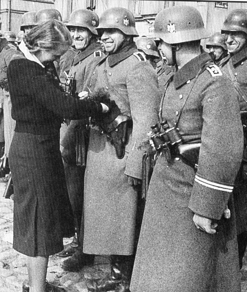 [Above: A German women tucking flowers into the belts of German soldiers.]