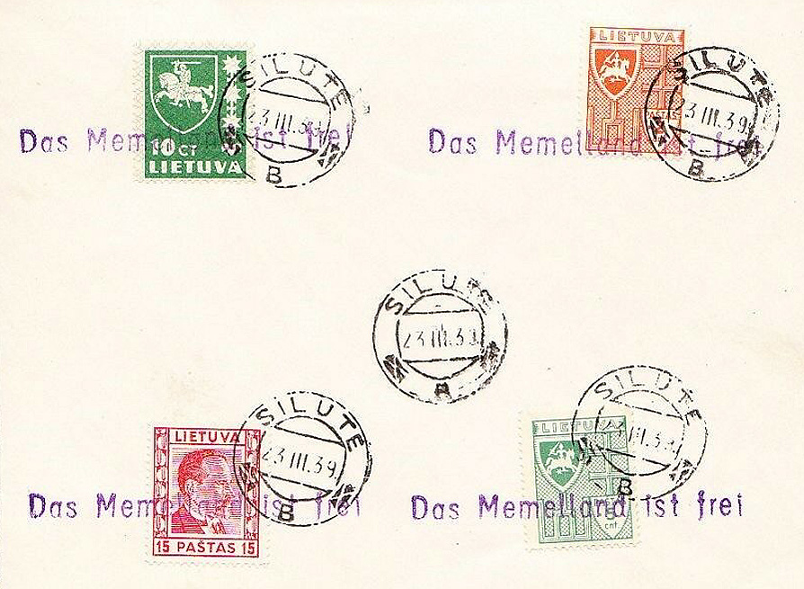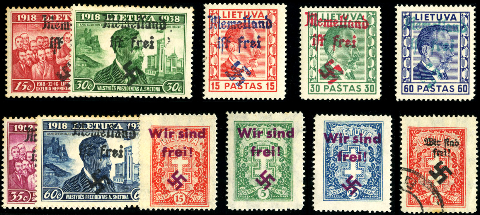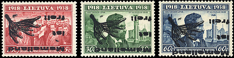 [Above: A philatelic sheet showing special Memel cancels on Lithuanian stamps.]