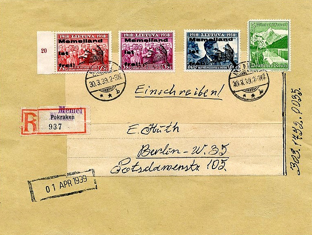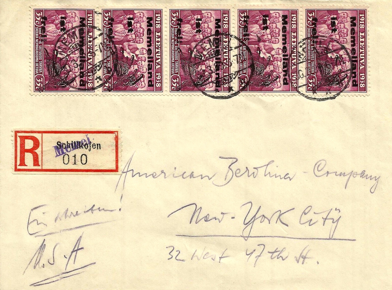 [Above: A strip of Memel overprinted stamps sent to New York City. Note even the registration label is overprinted 'Memel'.]