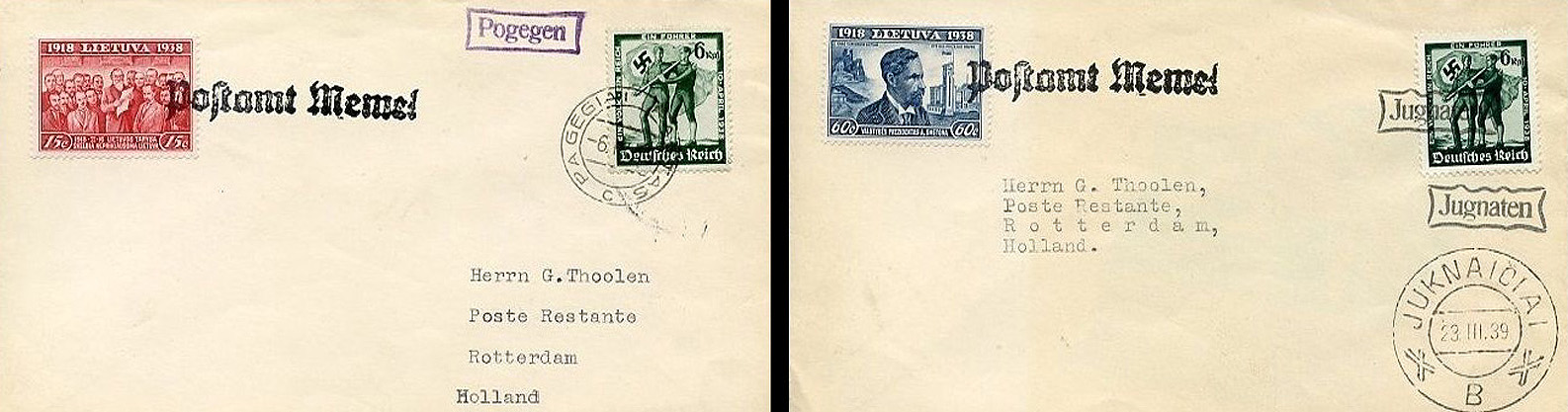 [Above: Two different envelopes from the days of liberation in Memel. This time we see Lithuanian stamps being allowed with German stamps. Postamt Memel (Post Office Memel) and 'Pogegen' and 'Jugnaten' are towns in Memel.]