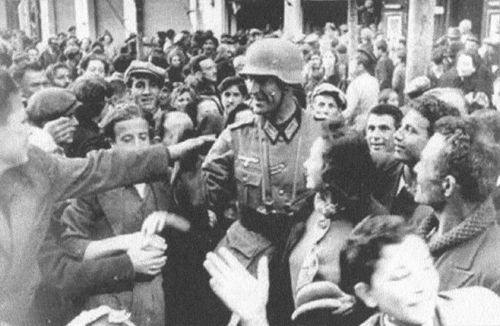 [Above: (left) Greek soldiers surrender to German forces with Roman salutes. (right) Thessalonians heartily welcome the Germans.]