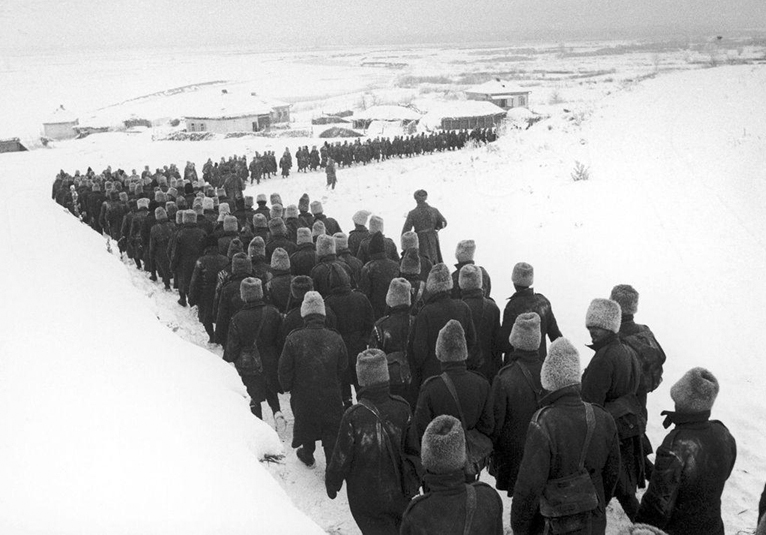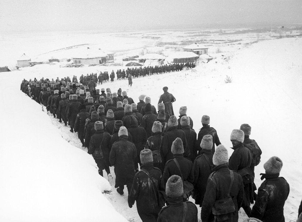[Above: (left) German soldiers clearing the streets in Stalingrad. (right) A long column of Romanian POWs captured by the Soviets at the Battle of Stalingrad.]