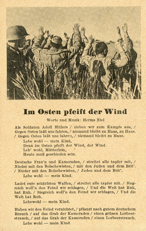 [Above: Postcard entitled 'In the East the Wind Whistles' It begins: 'As soldiers of Adolf Hitler - we march to battle, Eastward let us go...']